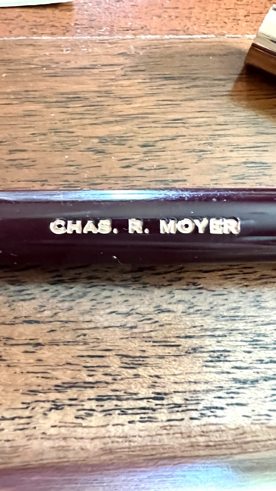 in very good condition, the pen body is not marked, except that it has a name in gold letters "Chas. R.Moyer"; and the cap pocket clip is marked with "Marlowe"; and the clip is tight and is intact (see photos). There is no box.