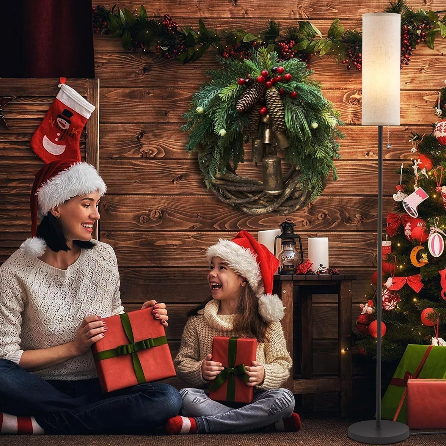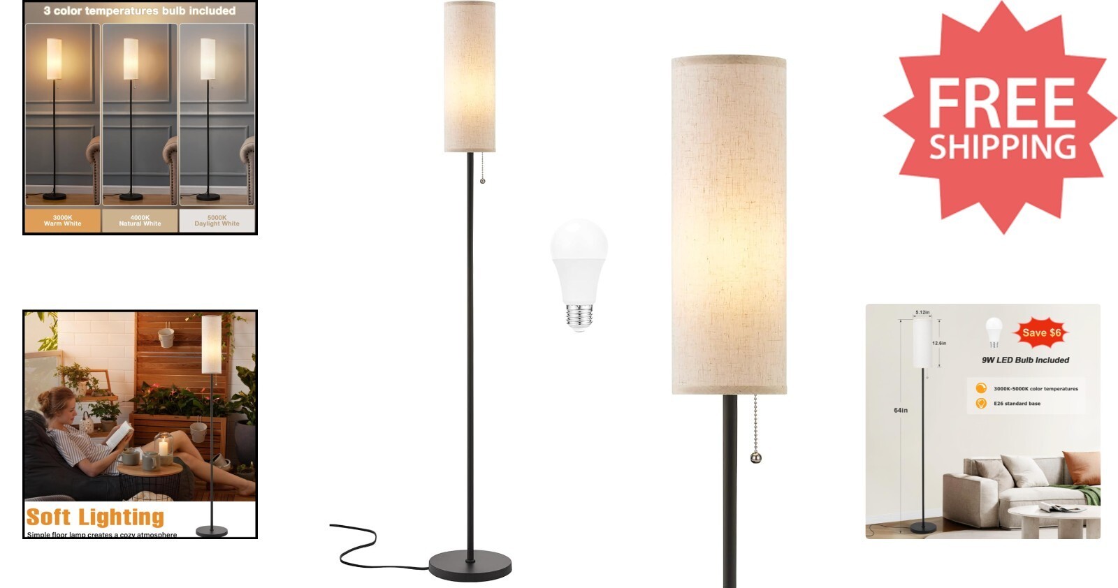 Upgrade your space with this versatile modern floor lamp, now including an energy-efficient 9W LED bulb with adjustable color temperatures of 3000K, 4000K, and 5000K to perfectly set your room's ambiance. Crafted with a stylish linen shade and sleek black pole, it complements contemporary, retro, mid-century, and industrial decor styles. The convenient pull chain switch allows easy operation from behind furniture, making it perfect for living rooms, bedrooms, offices, or classrooms. Easy to assemble without tools, this minimalist lamp is an ideal solution for new house decoration, especially in rooms lacking ceiling lighting. Enhance any space with practical elegance and simple installation.