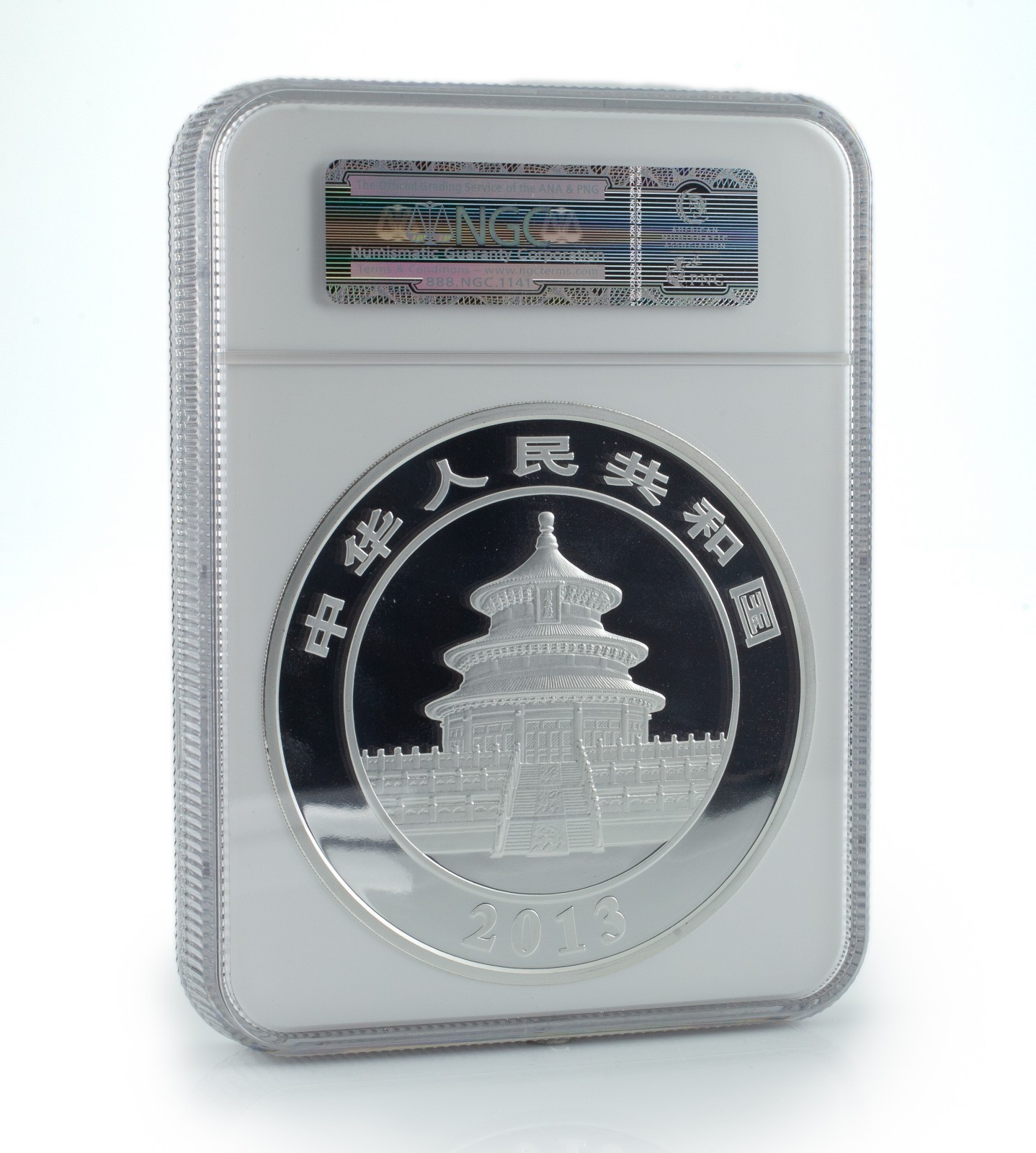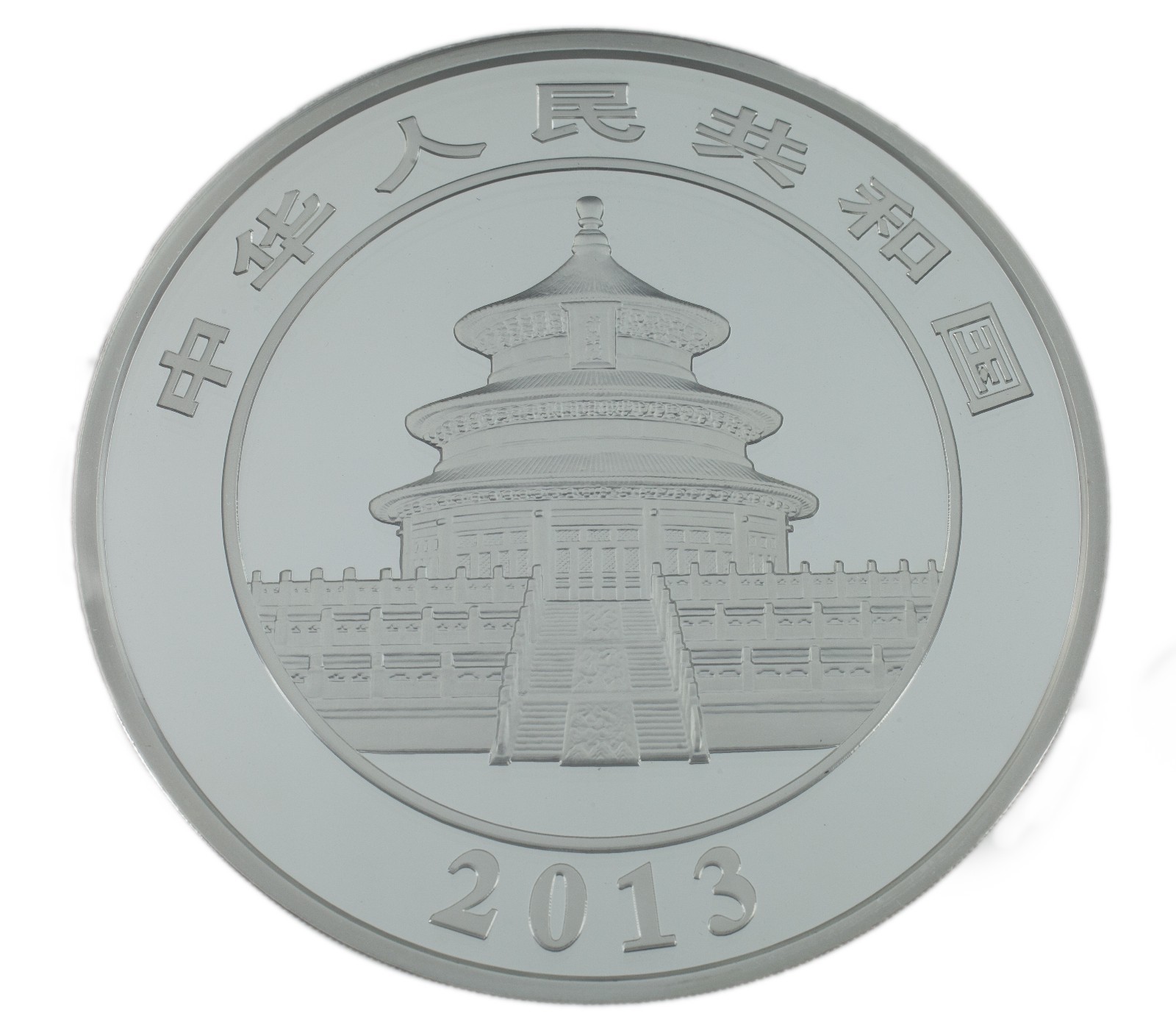 «La piece d'argent commemorative en panda chinois 2013 est un appel d'offres legal de la Republique populaire de Chine, publiee par la Banque populaire de Chine, frappee par Shenyang Mint Co., Ltd., et uniquement distribuee par China Gold Coin Incorporation. L'avers depeint le temple du ciel a Pekin, le titre de RPC et la date de l'annee. L'inverse presente de l'eau potable geante des pandas, les mots «1 kg ag .99» et la valeur nominale. Il s'agit de certifier que la medaille est a la hauteur de sa finesse et de son poids. "