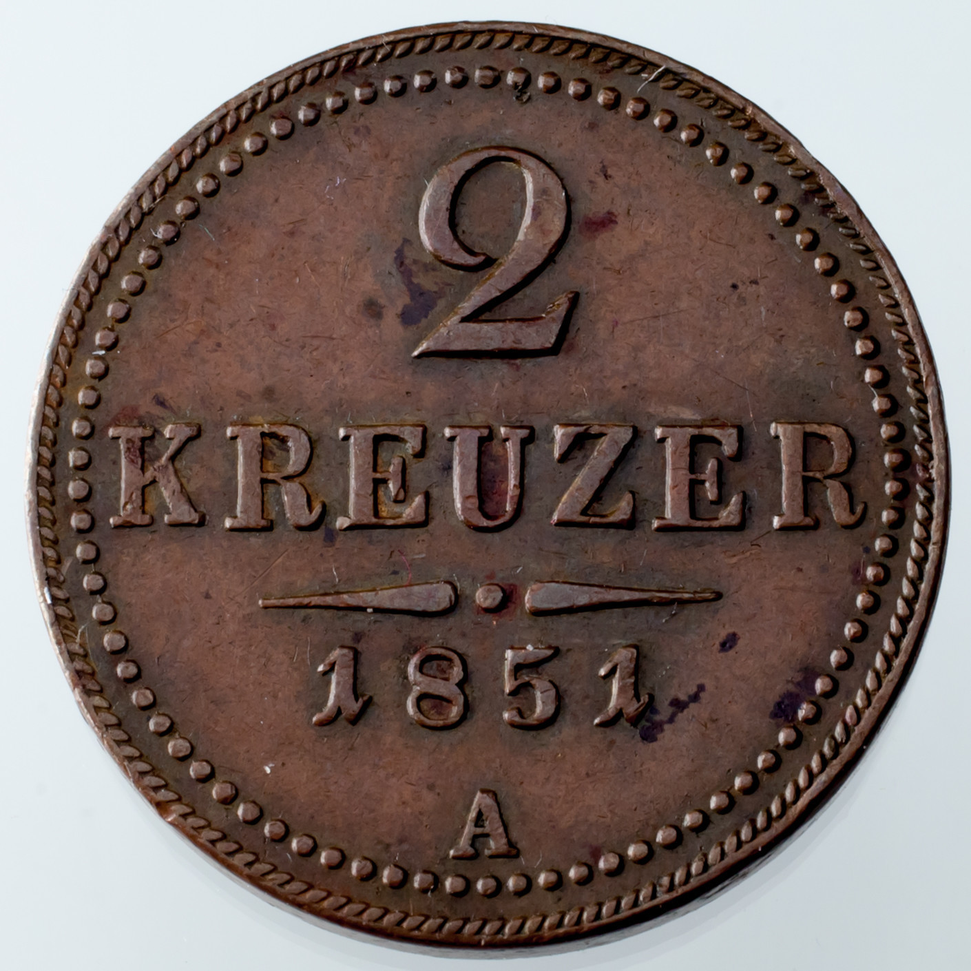 1851-A Austria 2 Kreuzer Copper Coin XF Condizione KM #2189