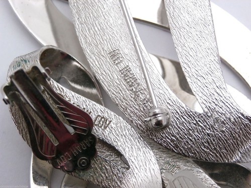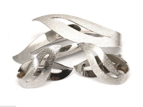 Signed Sarah Coventry Vintage Book Piece "Satin Flame" Brooch/Ears,Silver 1960