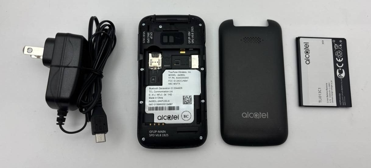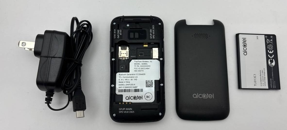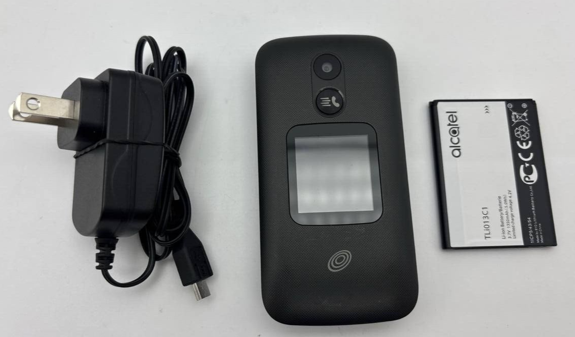 Item includes: Alcatel MyFlip 2 Cellphone, Charger Cable and Battery.