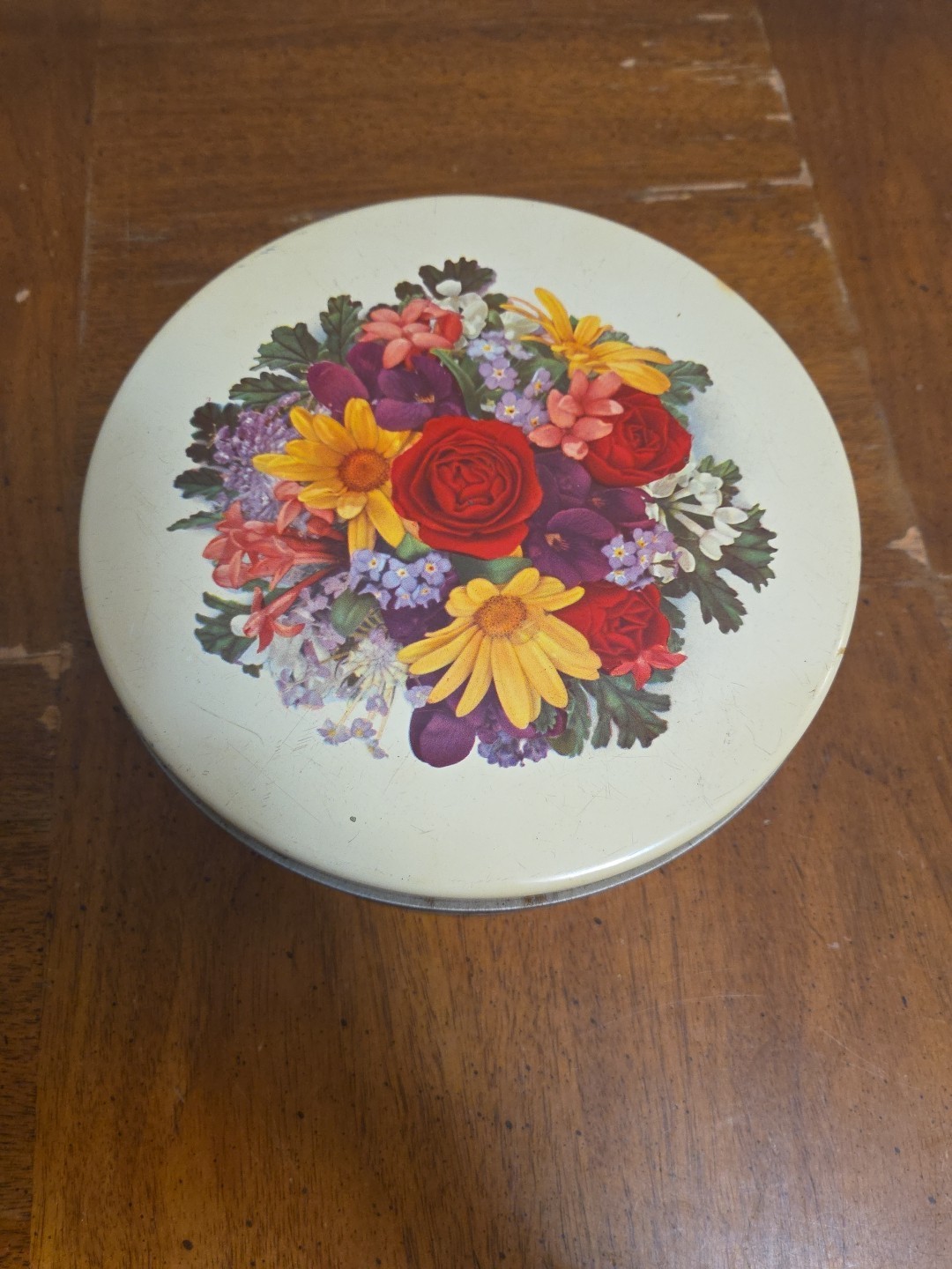 Deluxe Fruitcake Tin 7 In Floral Cookie Canister Vintage Sewing Corsicana Texas