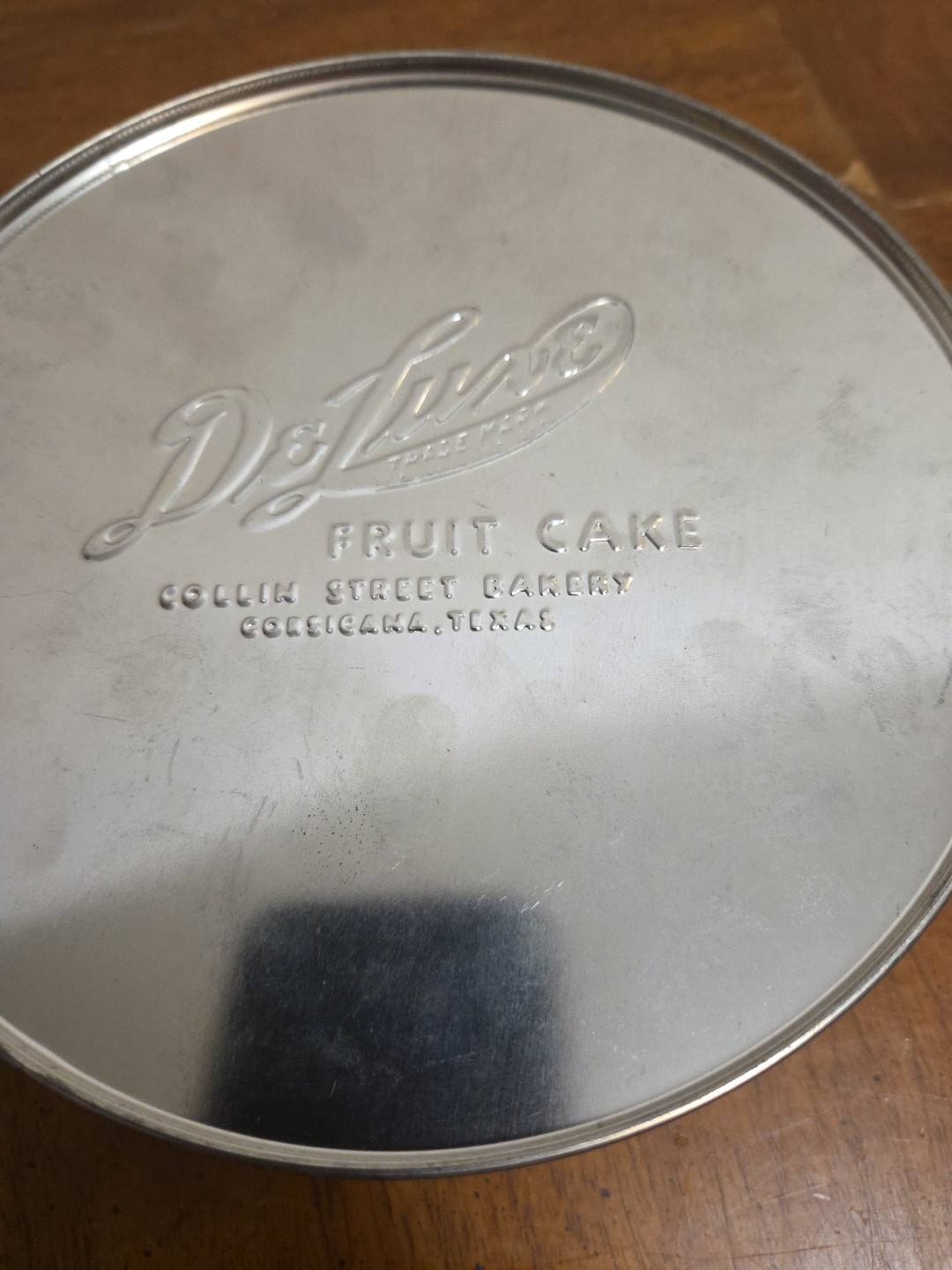 Deluxe Fruitcake Tin 7 In Floral Cookie Canister Vintage Sewing Corsicana Texas. Condition is Used. Shipped with USPS Ground Advantage.