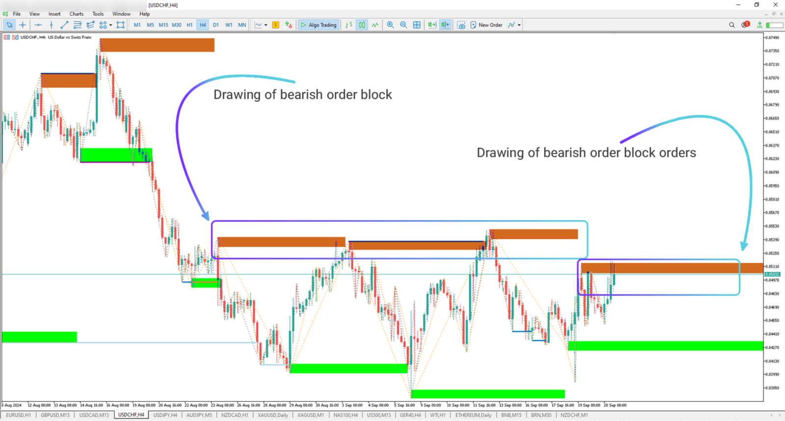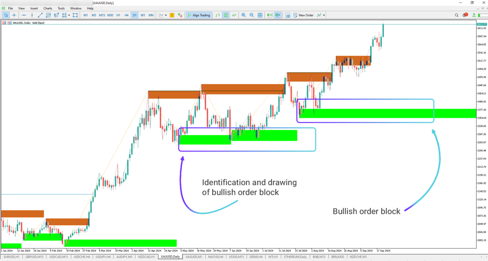 Bearish order blocks are shown in brown, highlighting zones with significant sell orders. Price reactions in these areas can be sharp, often triggering quick reversals, giving traders opportunities for precise sell entries.