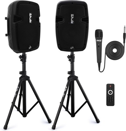 Reliable enough for important functions but powerful enough for outdoor shows, the Pyle Active Passive PA Dual Loudspeaker Sound System Kit won't let you or your customers down. This pair of 700 watts, self-powered speakers reproduce the entire audio spectrum. Play your music through Bluetooth, USB, SD cards, and more. Transport the speakers with the integrated carry handles and set them up for your event on the stands. This kit includes an active speaker, passive speaker, 2 stands, a wired microphone, remote control, and a power cable. These dual 8-inch high-powered loudspeakers kit from Pyle is a great way to get the high-quality sound you deserve whether you're playing music, watching the game, or having a karaoke night with friends.