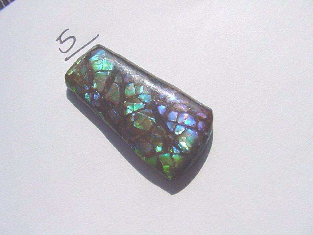 (Internal #J477) You are bidding on a rectangle shaped, polished Ammolite fossil cabochon, 1/14" long x 5/8" wide, green with blue going up both sides, snakeskin pattern. Nice for making jewelry or as a display specimen.