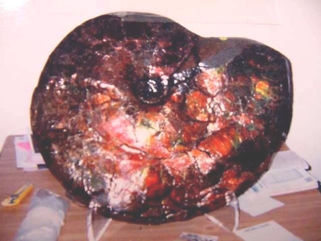 AMMOLITE CABOCHONS for jewelry: more precious than opals, these ancient pieces of shell fossils (ammonites a/k/a Chambered Nautilus Shells) from Canada absorbed the natural earth element aragonite when they fossilized which created these fantastic colors. Here's a photo of an example of polished ammonite from the Lethbridge mine, over 3 feet in diameter (2nd photo).