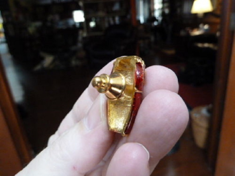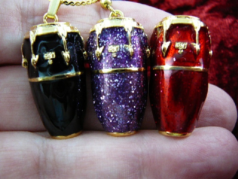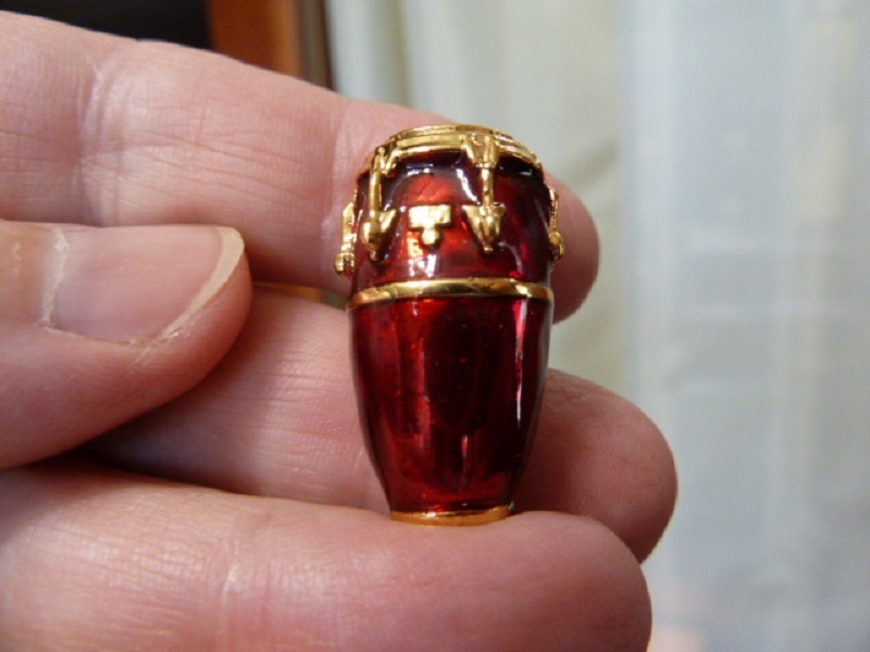 (M-317-A) JEWELRY ONLY - NOT A REAL INSTRUMENT! You are bidding on this cool miniature replica of the first fiberglass conga, created in the 1960's by Latin Percussion. Cast in pewter with sparkle RED enamel and 24k gold electroplating, it is 1-1/8" long, hollow on the back, pinch back tack pin for hat or lapel, guy or gal.