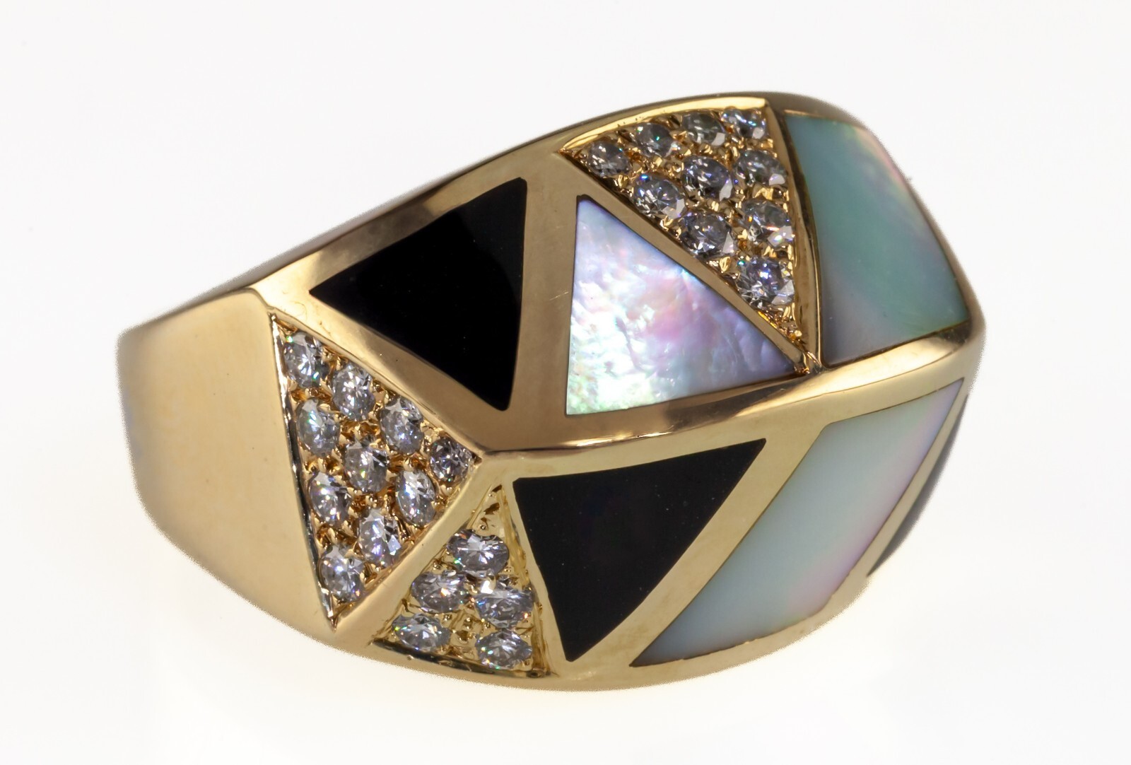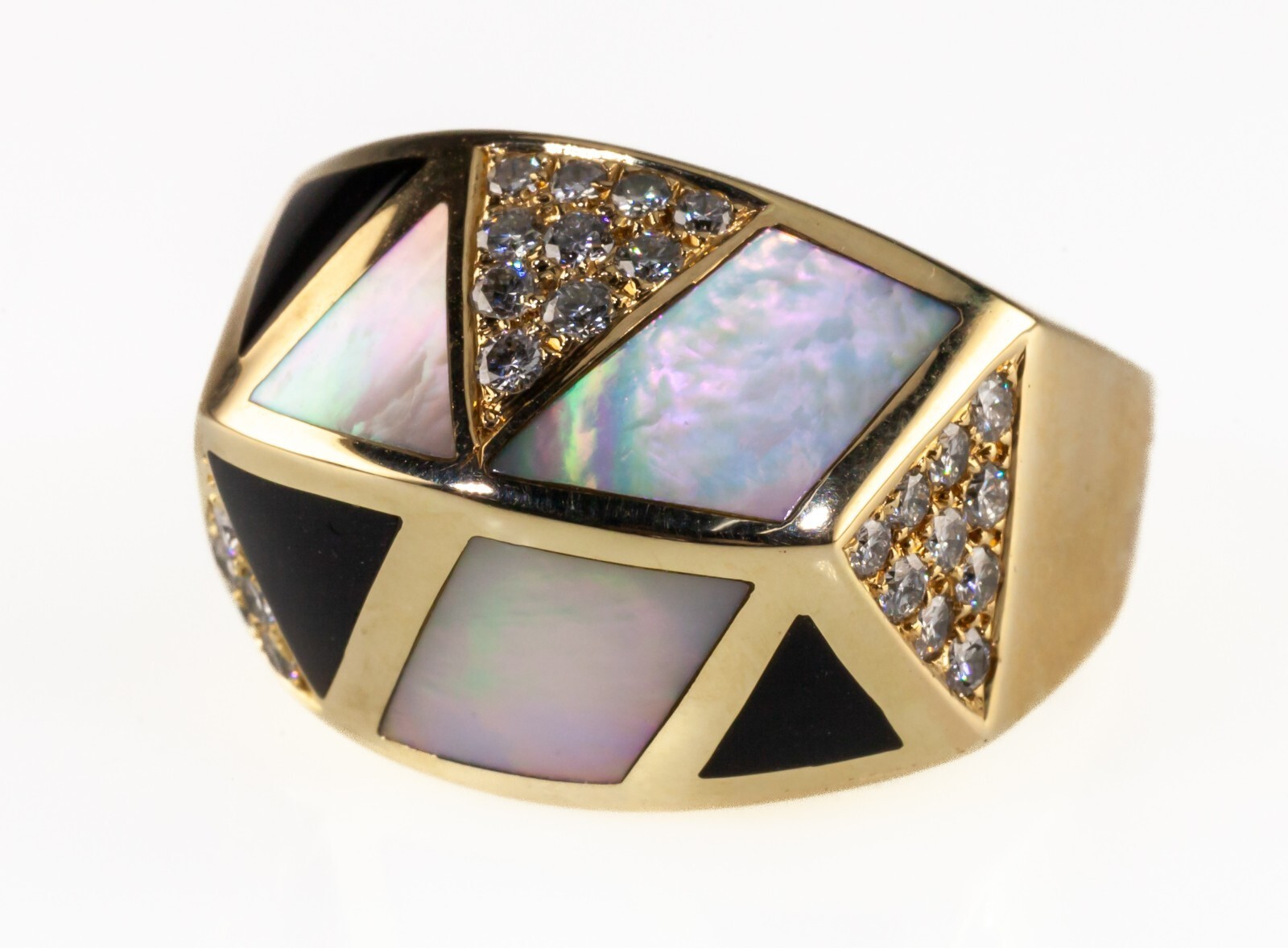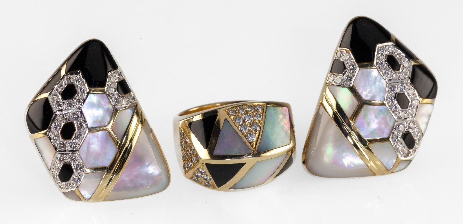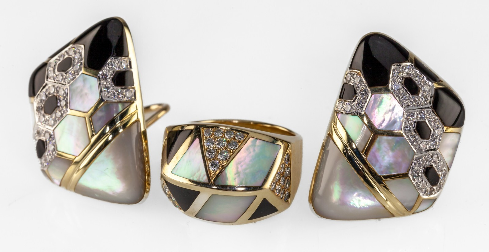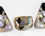 14k Gelbgold Perlmutt, Onyx, und Diamant Ring Und Ohrring Set