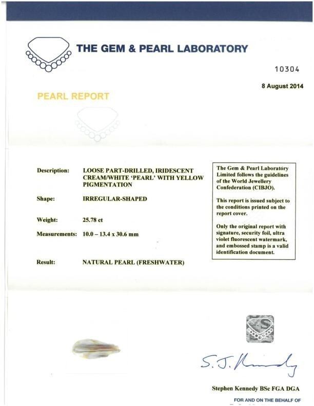 Overall Condition: Good, Main Freshwater Pearl is slightly loose. Includes Facsimili "The Gem and Pearl Laboratory" report #10304, dated August 8, 2014, stating the pearl as Natural Freshwater Pearl. See Photos for Details.