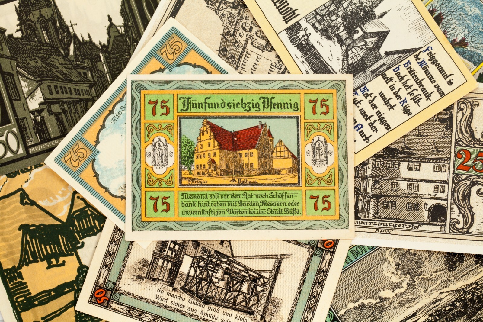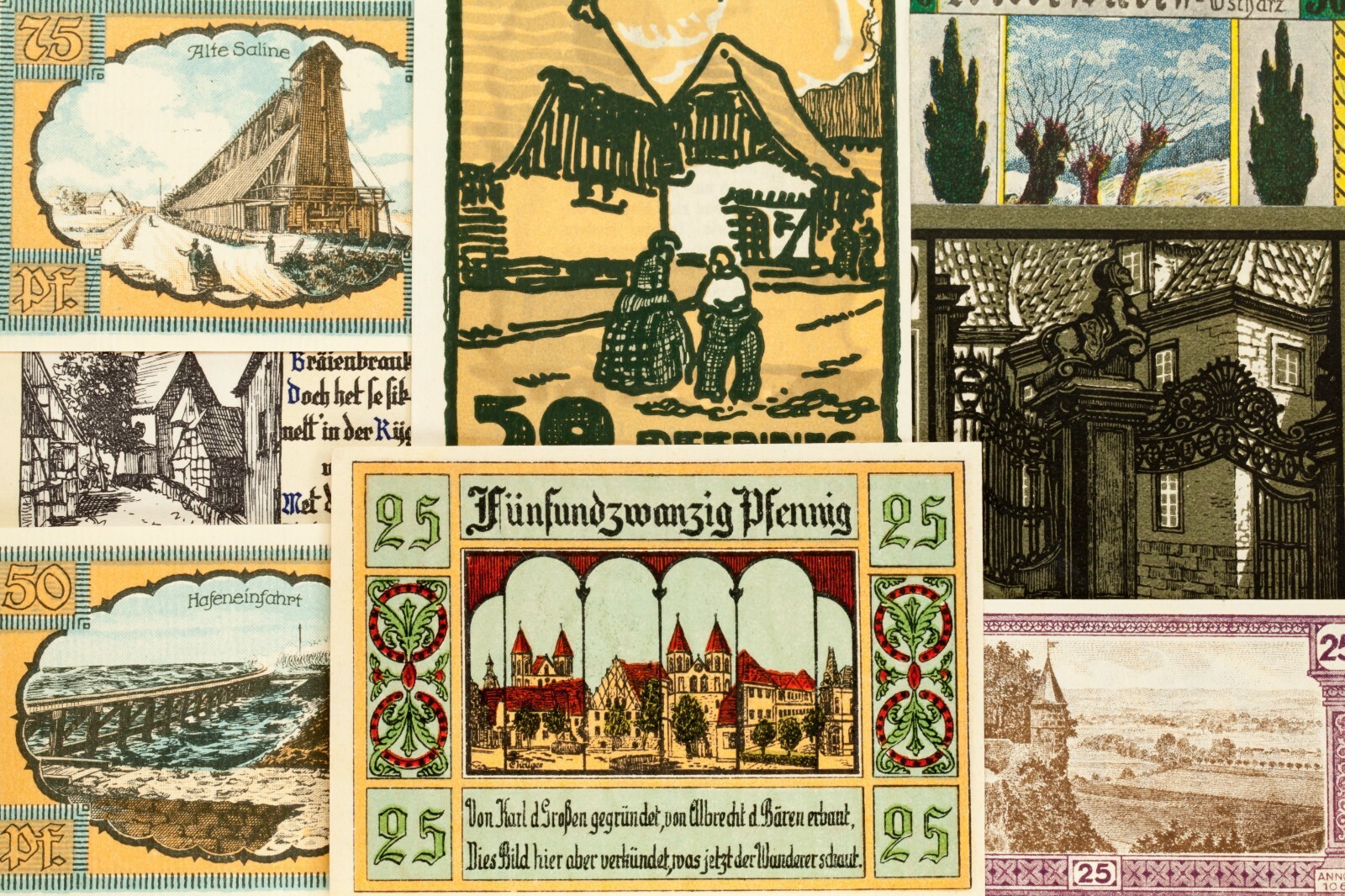 This lot will include 25 individual notgeld notes from Germany after World War I. All will be in Extra Fine to Uncirculated (XF-UNC) condition. Face values between 5 pfennig to 5 mark. City views theme; landmarks, famous buildings and landscapes.