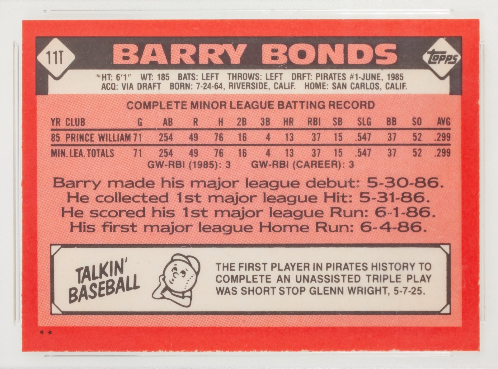 - 1986 Topps Barry Bonds Rookie Karte Nr. 11T Von PSA Als Mint 9 Bewertet