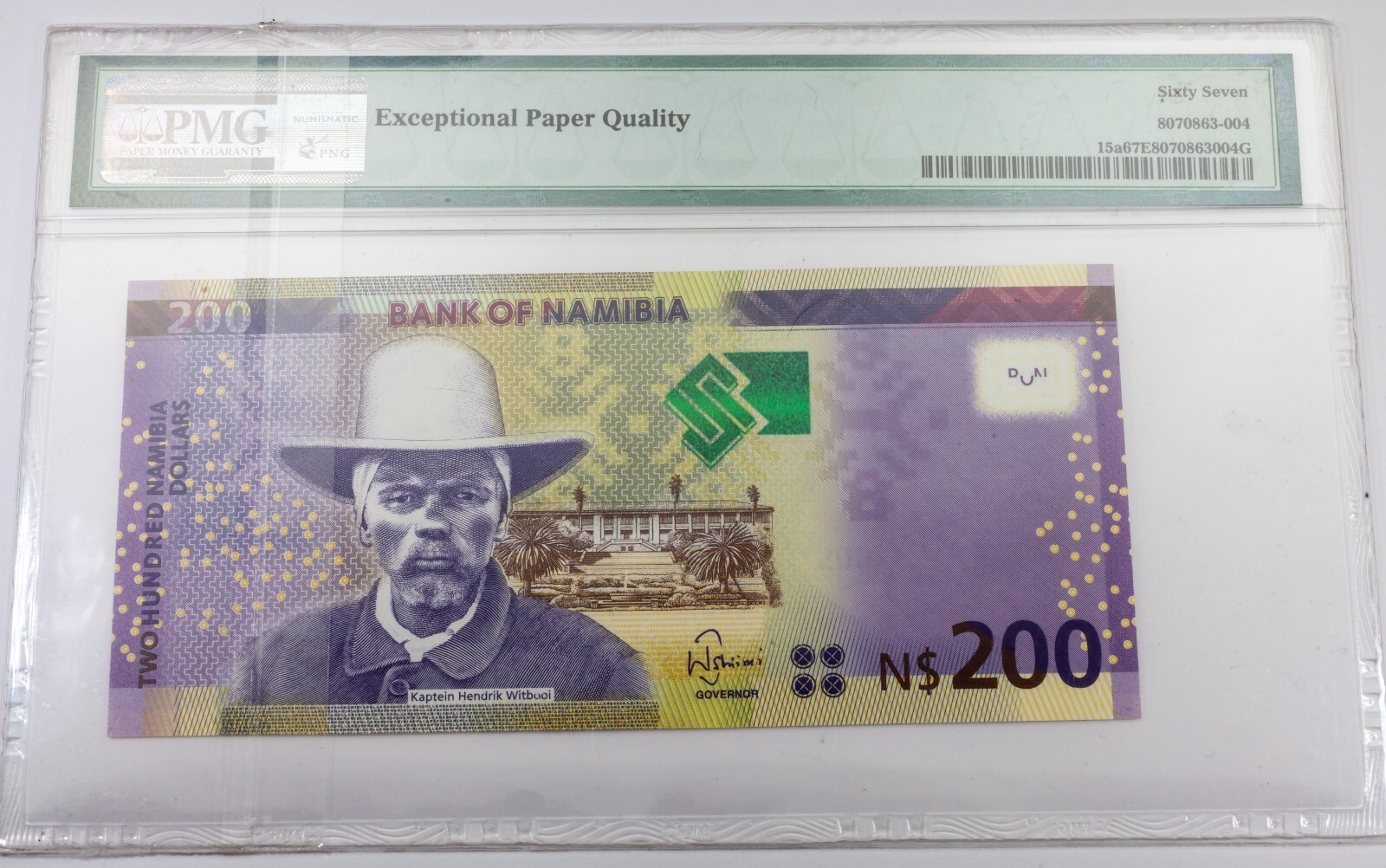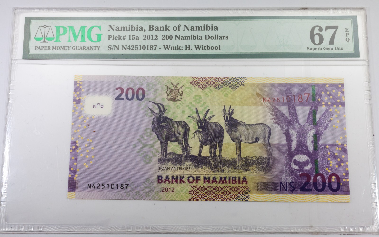 2012 Bank of Namibia 200 dollars classes par PMG sous le nom de GEM UNC 67 EPQ Pick # 15A