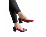 70s Frank Morr Premier Class Comfort VTG Leather Pump Spain Sz 9.5 Colorblock Blue Red Gold Square Toe-block heel. Also, one color panel and heels are in dark green. The vamp is leather, but the soles are not. Made in Spain. They are in excellent pre-owned vintage condition.