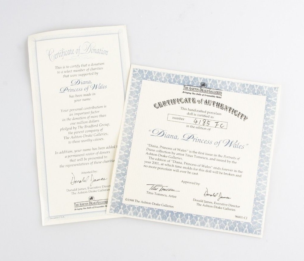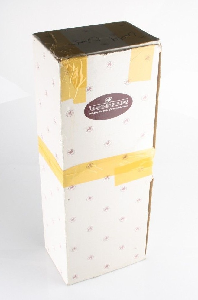 La poupee est dans le meme etat, mais la boîte a des signes moderes de degats et d'usure. La bande entoure au milieu de la boîte. La boîte est etiquetee a la main "Lady Diana". La poupee n'a jamais ete supprimee. COA et papiers originaux inclus.