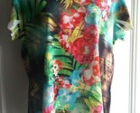 Beautiful vivid colorful tropical print, with small studs, V-neck, shirttail hem.