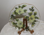 Beautiful Hand Painted Yellow Flower Decorated Clear Plate with Gold Trim. Very lightweight. This beautiful late does have a few chipsand scratches on it. It is still a very beautiful plate. Please let my pictures be part of my description.