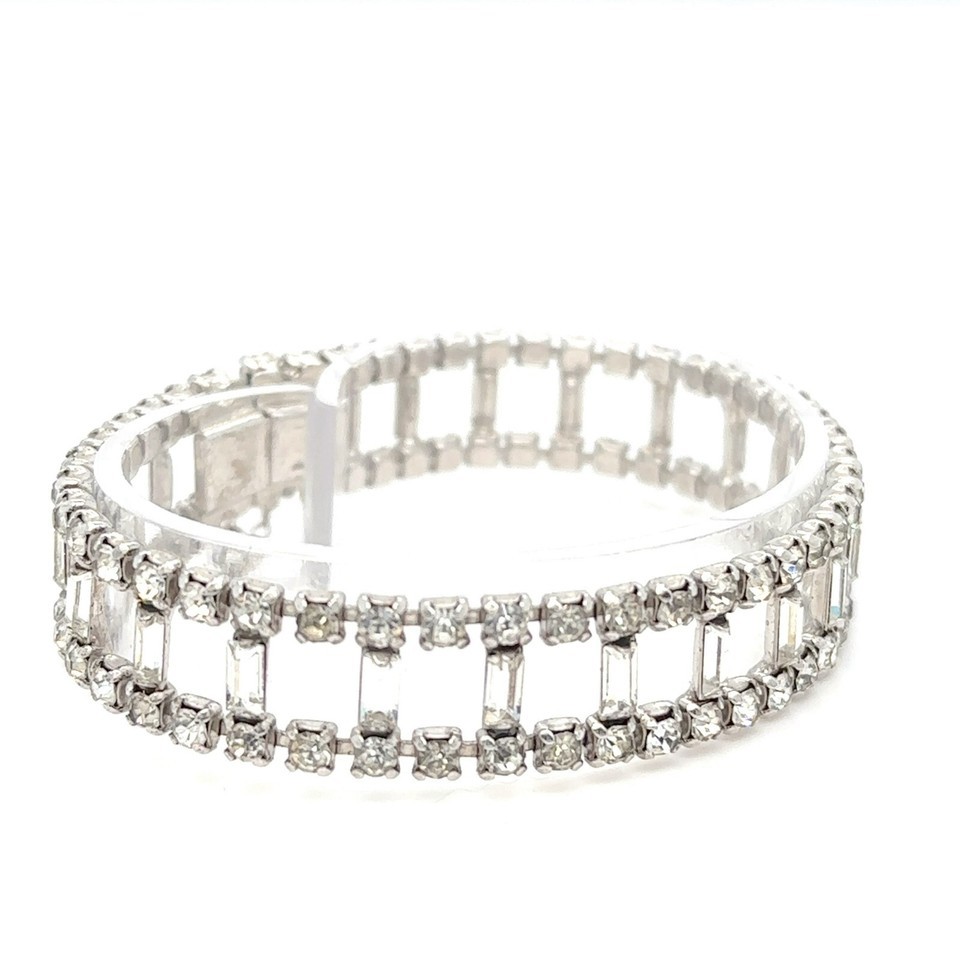 Bracelet de strass vintage avec des rangees paralleles de pierres de set a broches rondes reliees par des pierres coupees en emeraude avec une fermeture de fermoir.