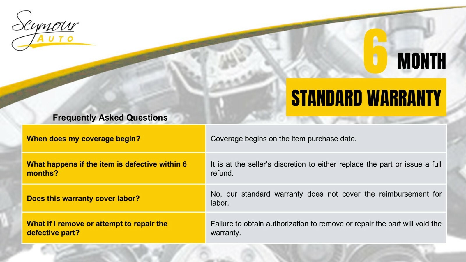 All parts come with our standard 6-month warranty. Please contact us for more details prior to ordering. The warranty begins as soon as the buyer takes possession of the part.