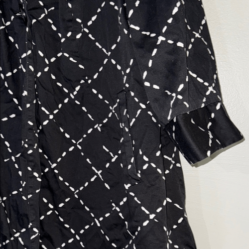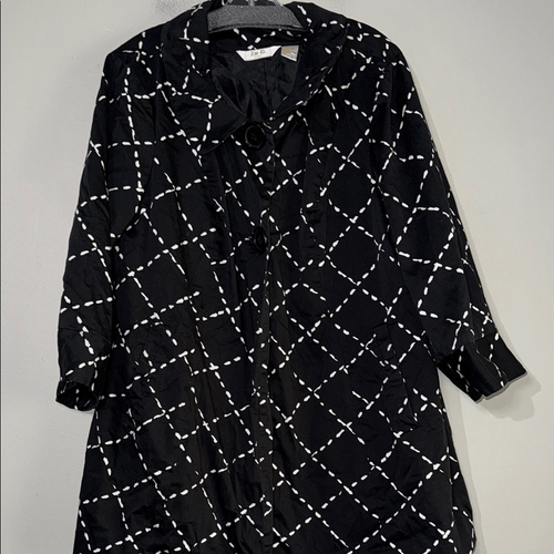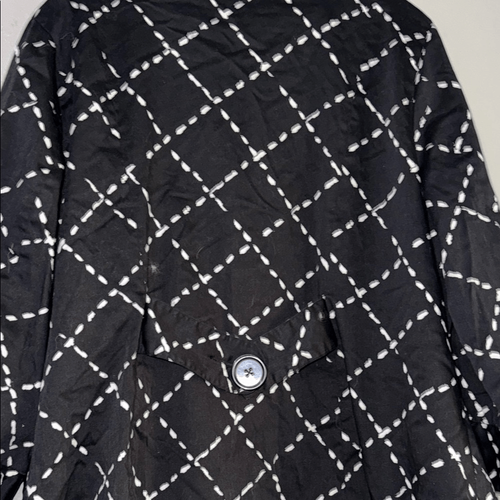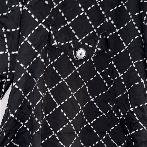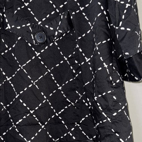 Elegant black coat featuring a white grid design. Accented with large buttons and a classic collar.