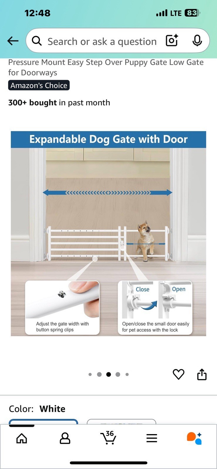 The Dog Gate by Malier is an extra wide and short pet gate specifically designed for dogs. With a small door for easy access, this all-metal gate is sturdy and durable. The gate can be pressure mounted and features a latch closure for secure use. The compact size of 10''H 26''- 41''W makes it ideal for small spaces, and the white color adds a sleek and modern look to any room. This gate is a reliable solution for keeping your pet safe while allowing them to move freely within your home.