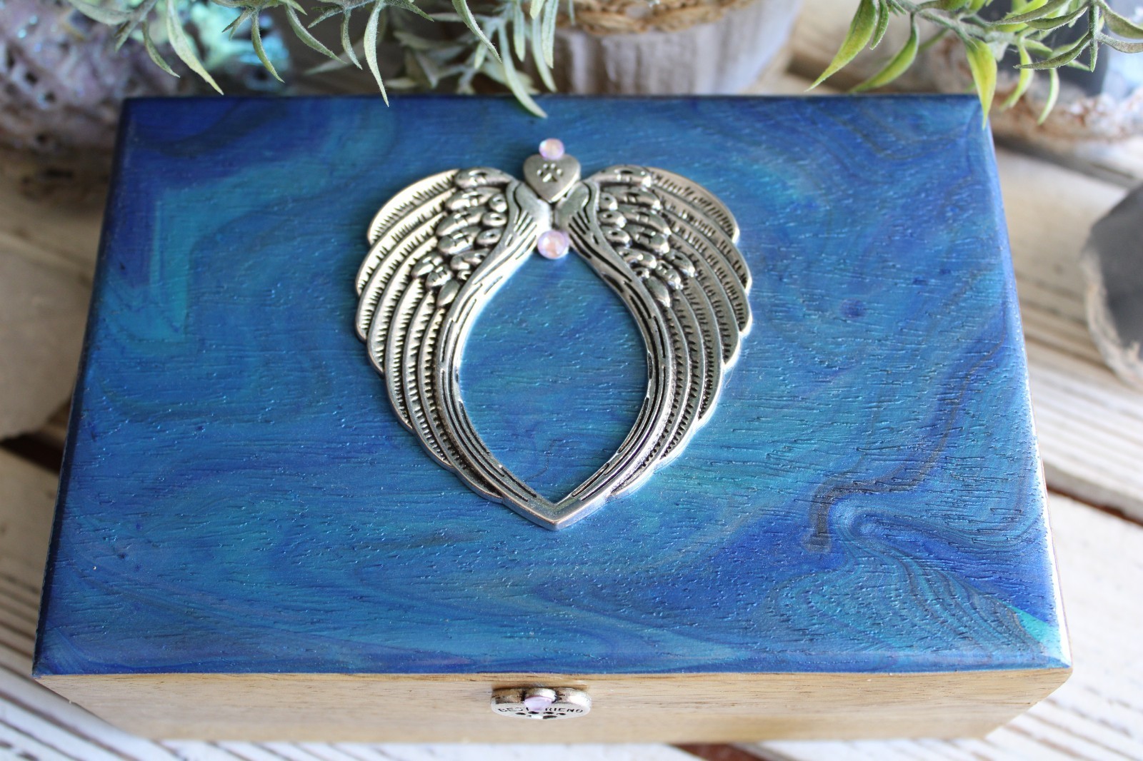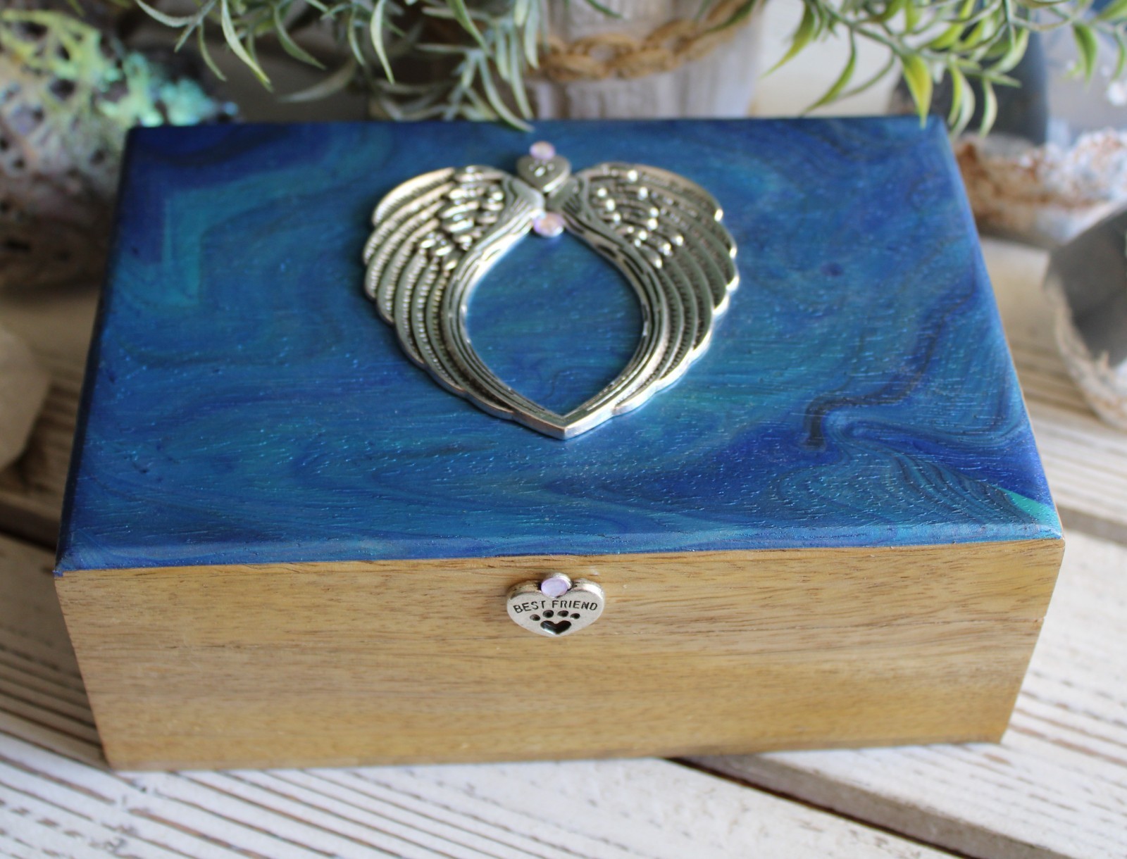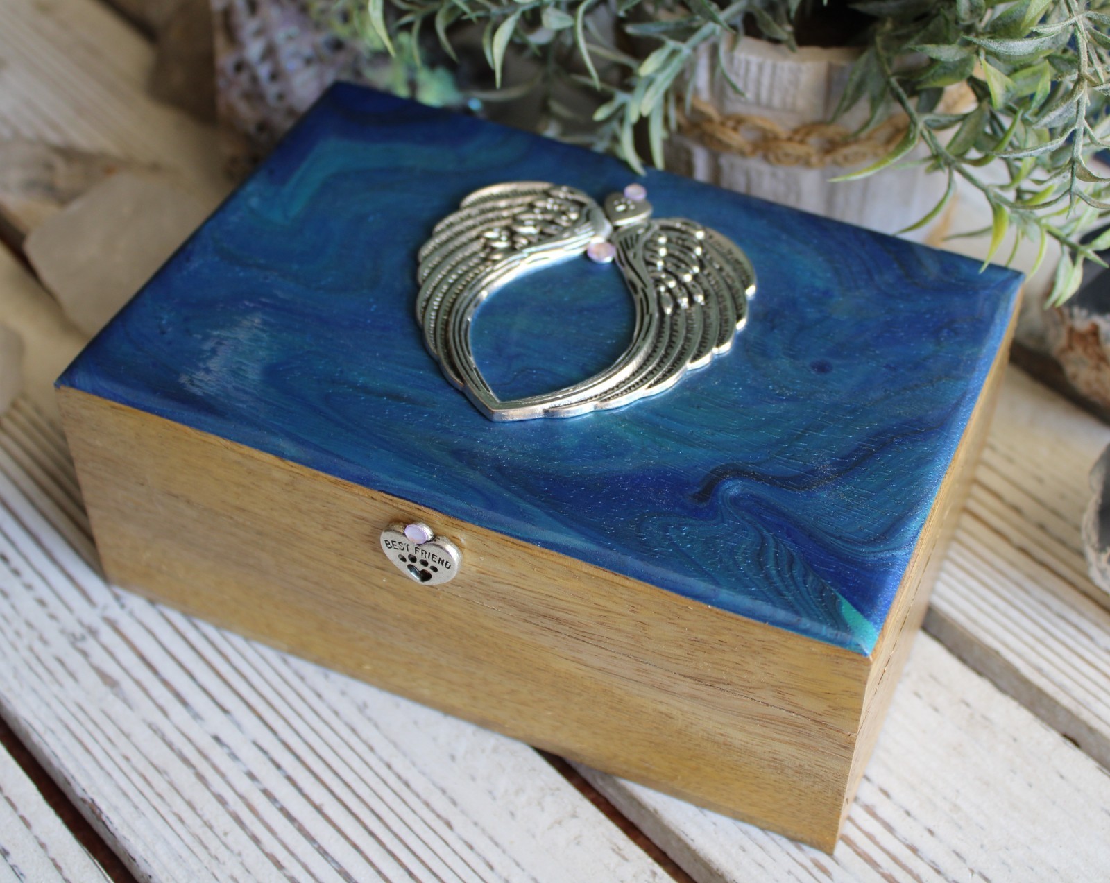 This is a Memorial Urn with angel wings for your beloved Dog. It measures 6" x 4" x 2.5". I created it using the acrylic pour method, so no two will ever be alike. This Urn box will accommodate the remains for a pet up to 30 pounds.
