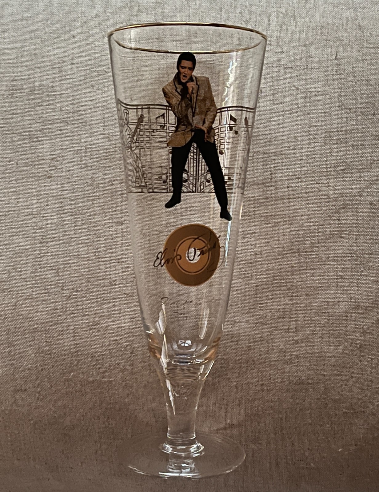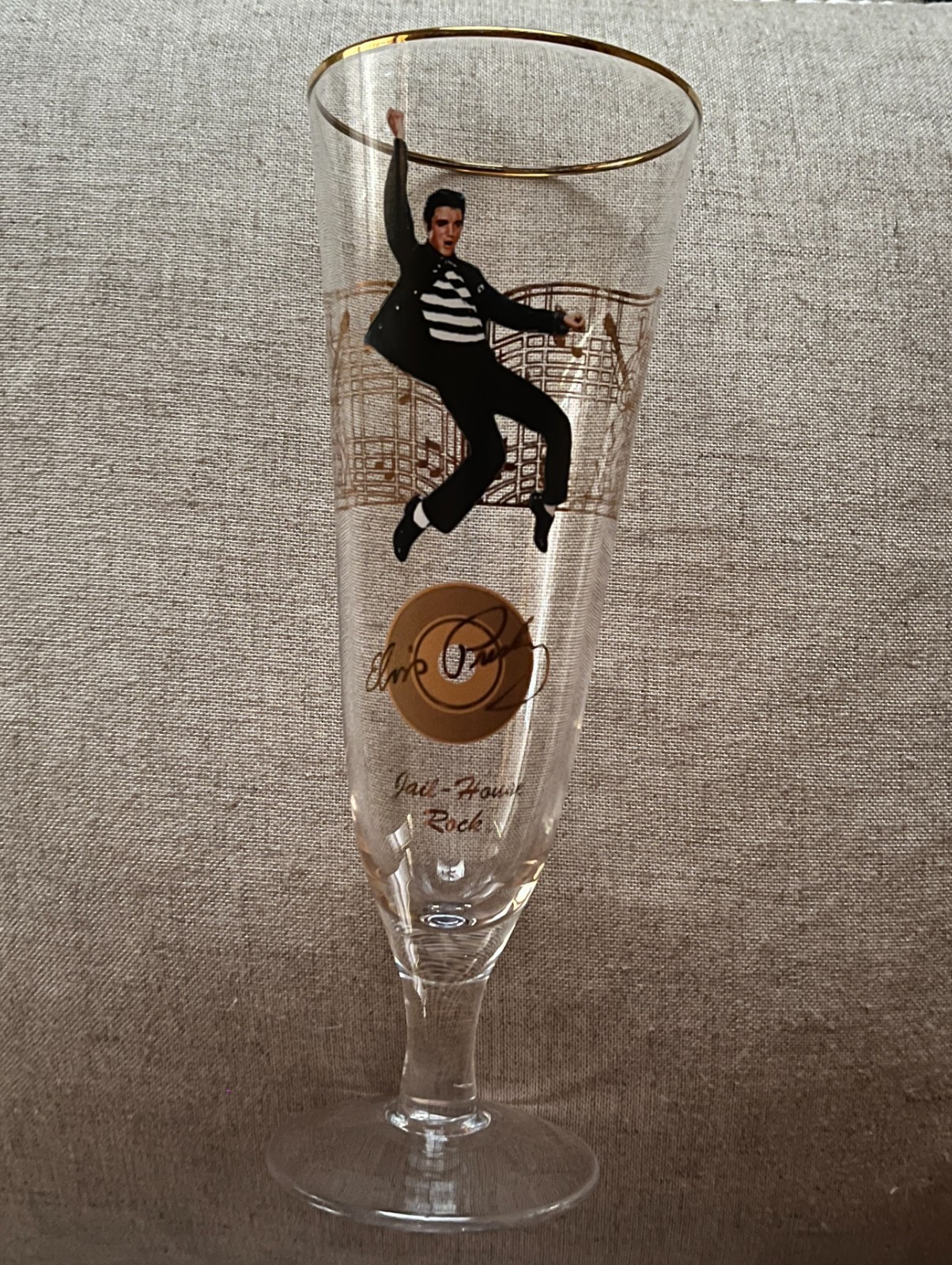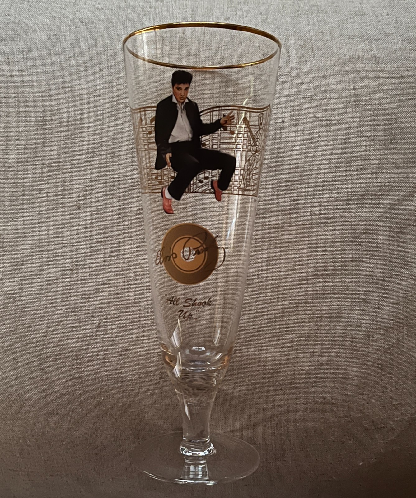 Tall glass measures 8.5" x 3" and has a gold rim