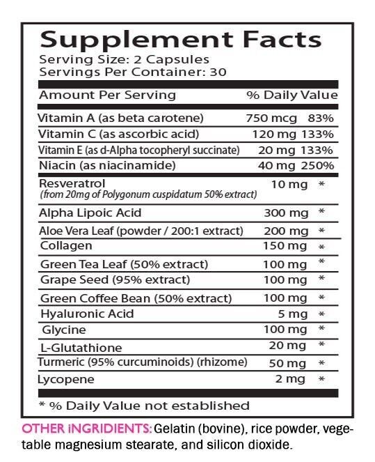 Resveratrol, Alpha Lipoic Acid, Aloe Vera Leaf, Collagen, Green T |