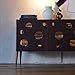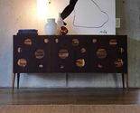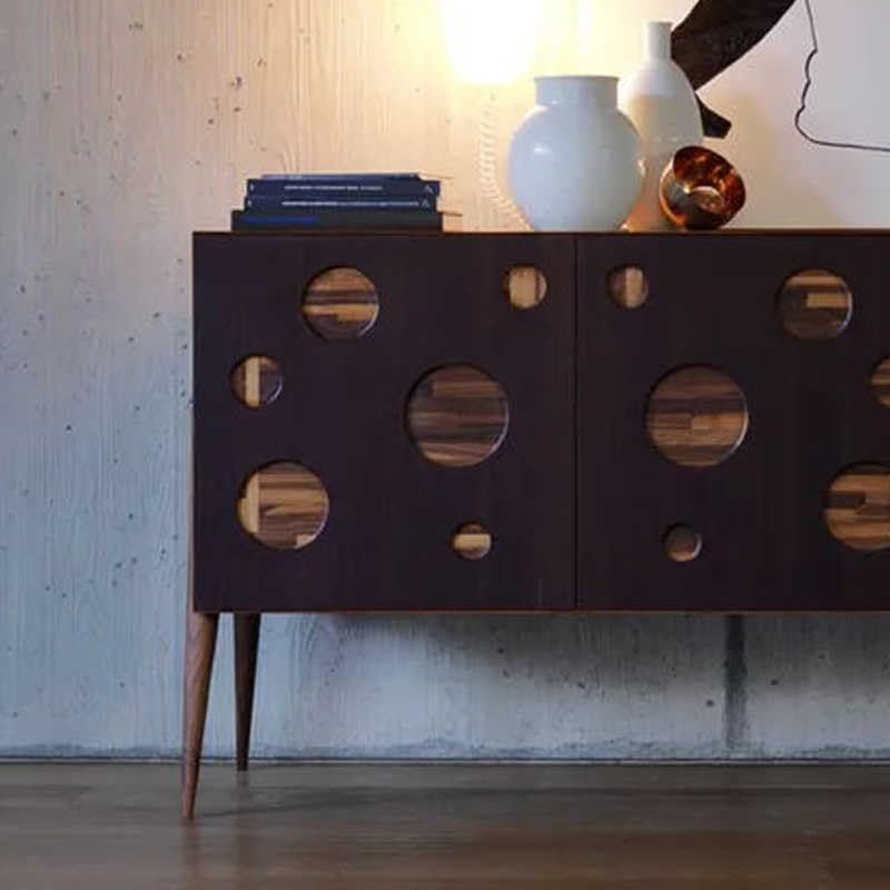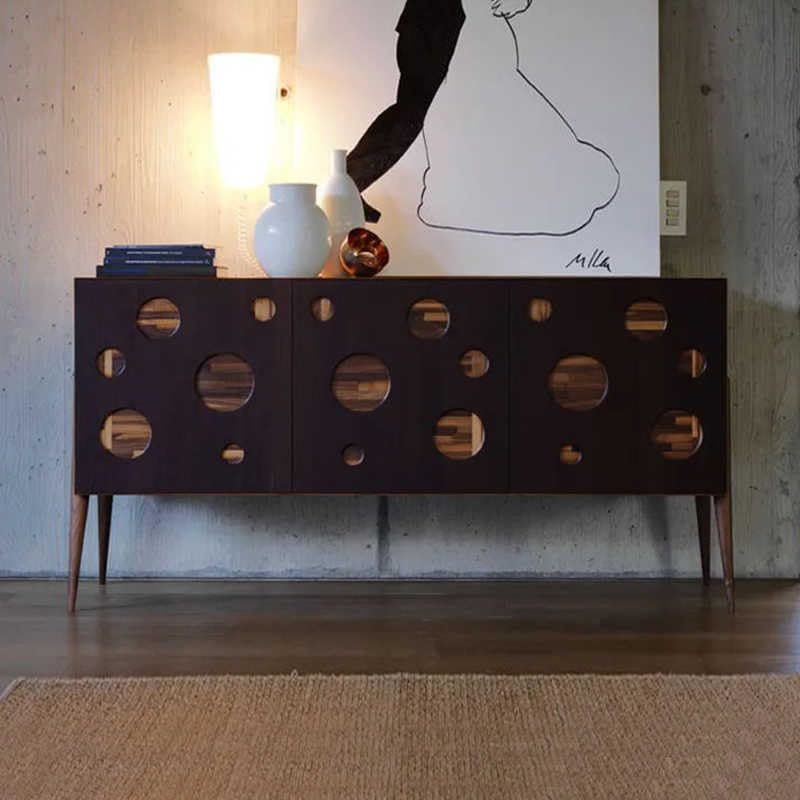 Elevate your living space with this stunning Italian Mid-Century Modern sideboard featuring an eye-catching circular cut-out design. The rich walnut wood construction showcases meticulous craftsmanship through varying sizes of circular apertures that create visual intrigue while revealing the natural grain patterns beneath. At 150x50x87cm, this sophisticated storage piece strikes the perfect balance between form and function. The dark exterior finish contrasts beautifully with exposed walnut accents, while classic tapered legs add an authentic mid-century touch. The spacious interior provides ample storage for dining essentials, display items, or media equipment. This versatile credenza works seamlessly as a dining room sideboard, living room storage solution, or statement entryway piece. The clean geometric lines and artistic front panel design reflect true Italian design sensibility, making it an ideal choice for both contemporary and transitional interiors seeking that perfect blend of artistic beauty and practical storage.