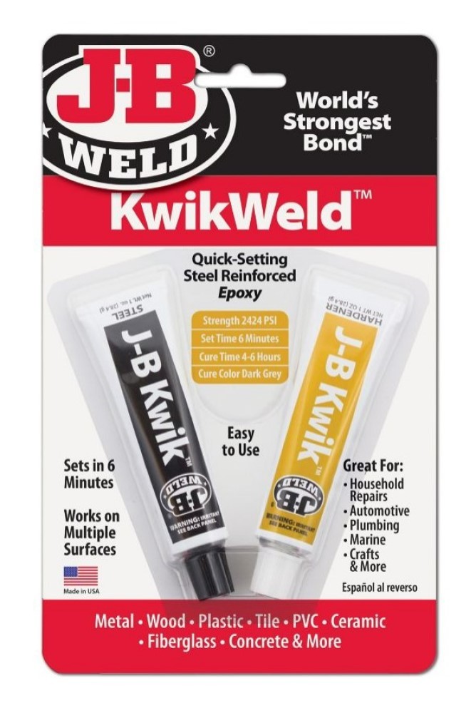 Fast setting version of The Original J-B Weld two-part epoxy cold weld system Great for household repairs, automotive applications, crafts and more Sets in 6 minutes and cures dark grey in 4-6 hours and rated at a tensile strength of 3127 PSI Once cured it forms a permanent bond and can be shaped, tapped, filed, sanded and drilled and will withstand temperatures of up to 230F