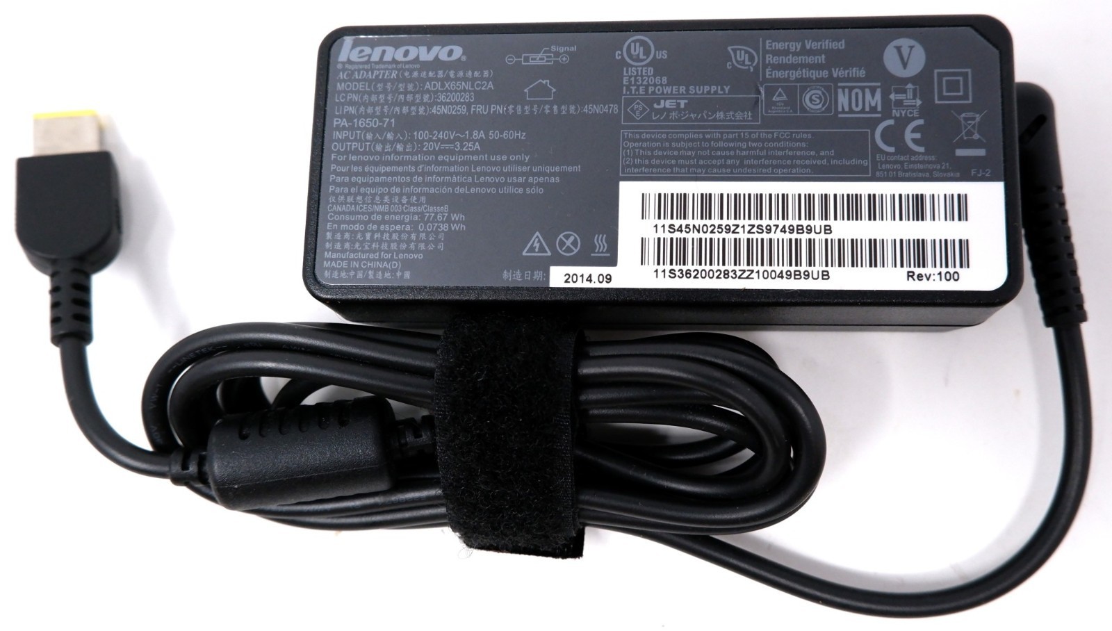 LENOVO 45N0259 45N0478 AC ADAPTER 20V 3.25A 65W RECTANGLE YELLOW TIP W/CORD- NEW