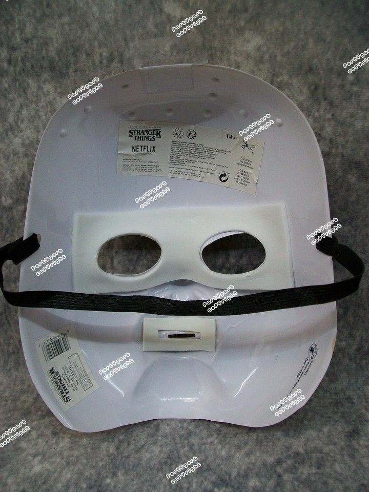 Eleven Baby Face Frontal Costume Mask. This mask is bigger oversized. One size fits most. For ages 14 and up. Has elastic strap. Be sure not to stretch or pull too tightly on elastic as it could come loose from the mask. Mask is made vacuform plastic. Has foam on the inside around the eyes and mouth. The foam can be seen from the front side and may need trimming. May have some light scuffs or marks. Can be used with many costumes:
