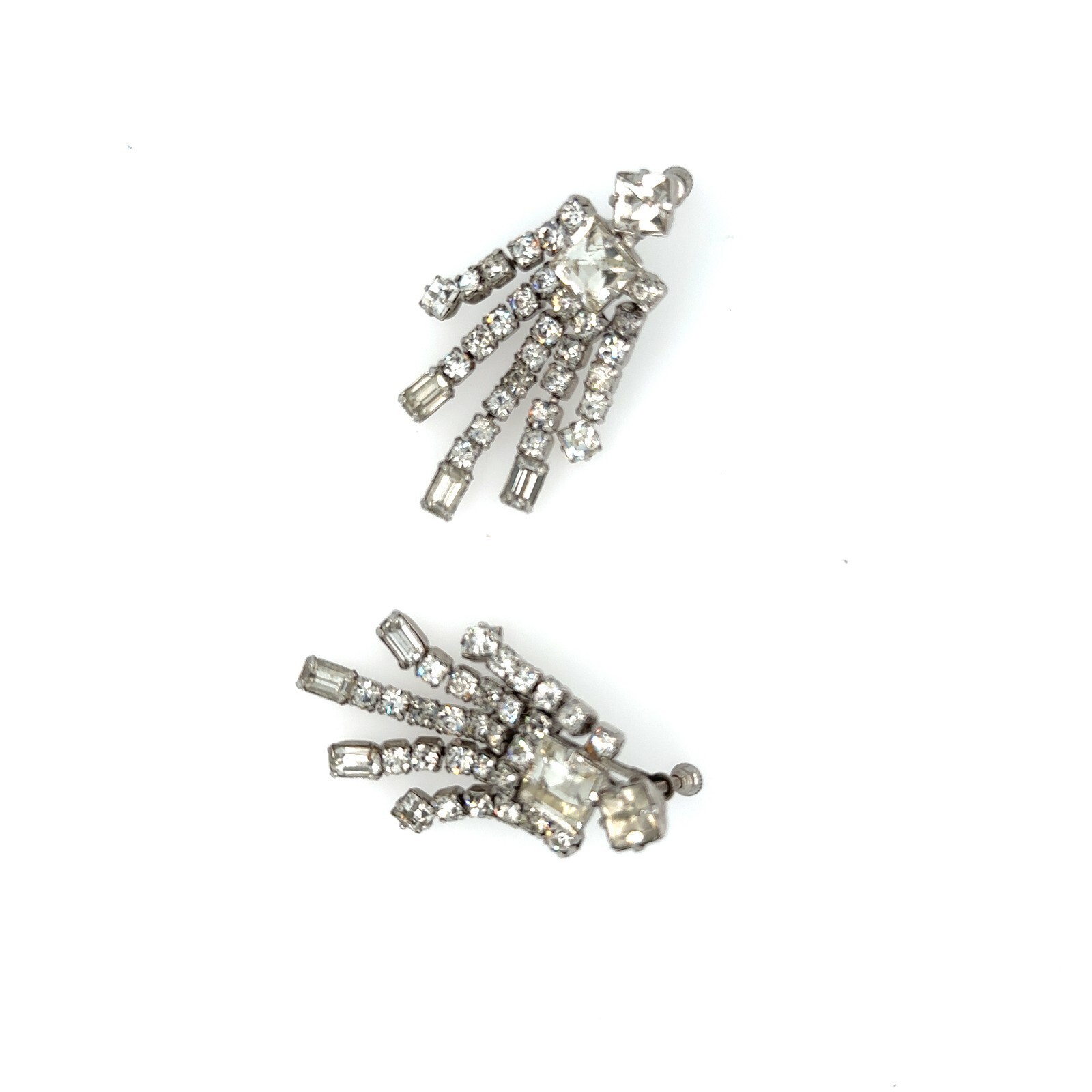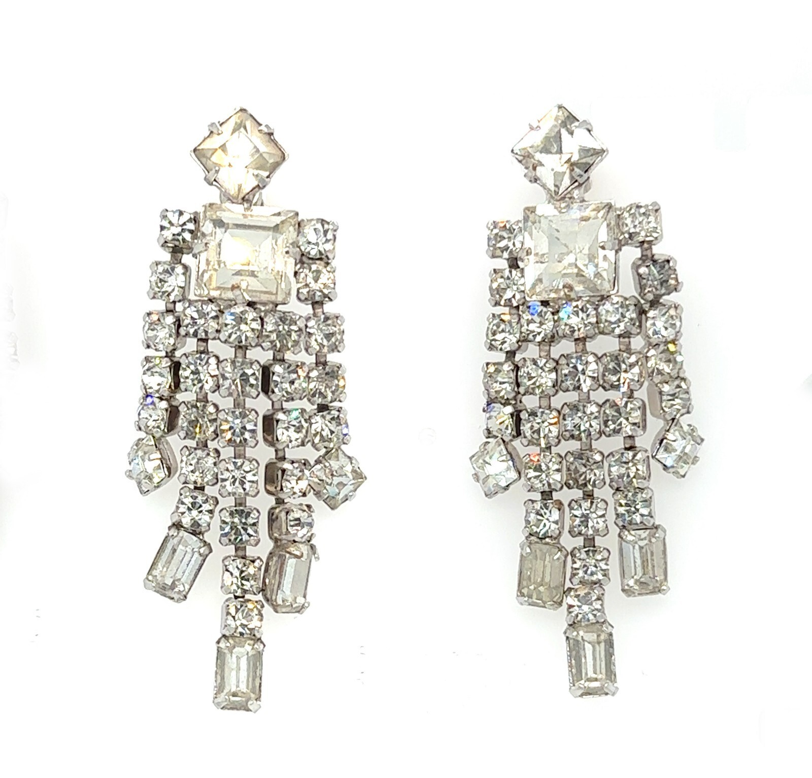 Central square stones with five cascading rhinestone drops of graduated length with screw post backs.