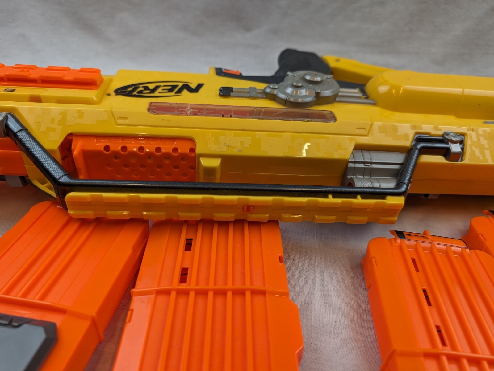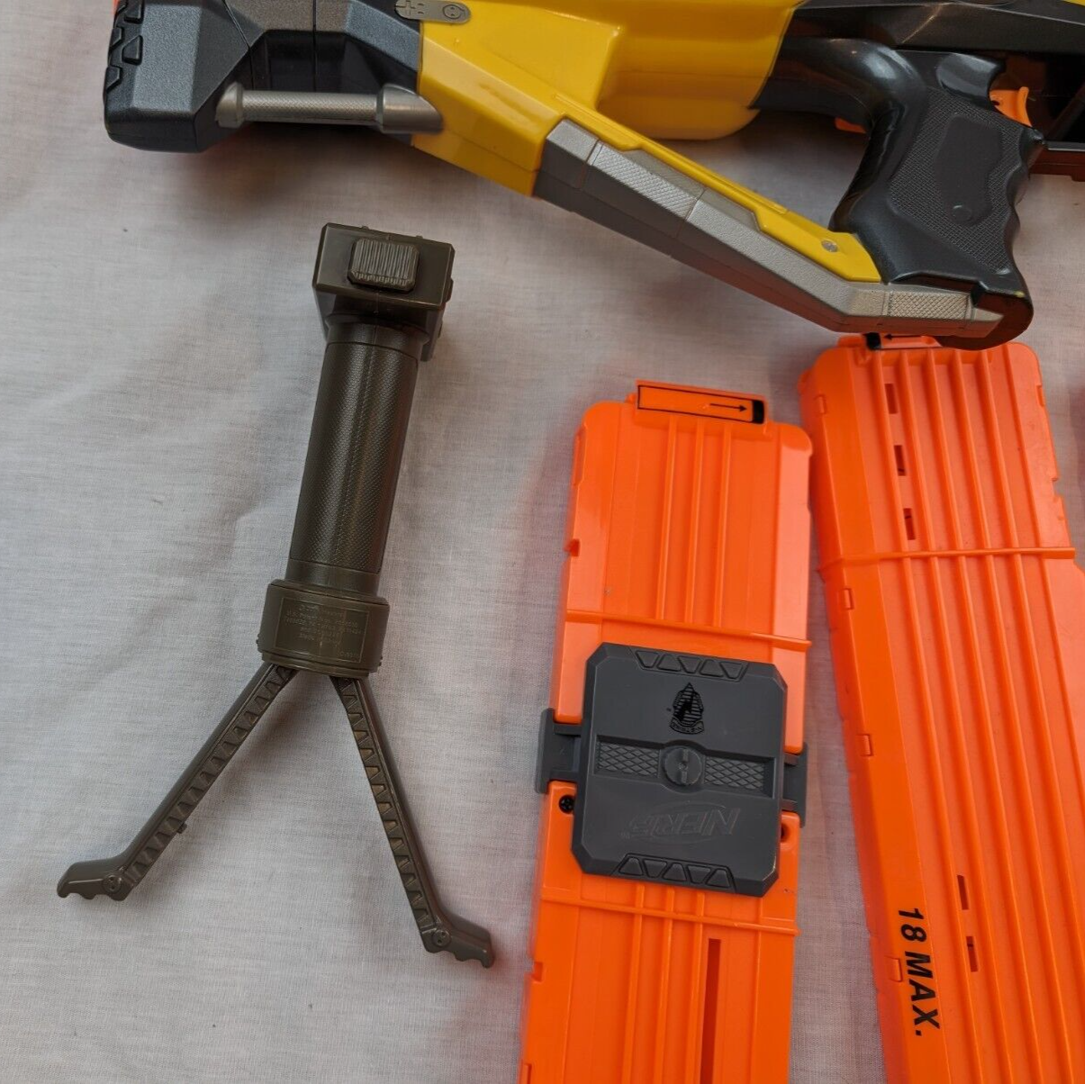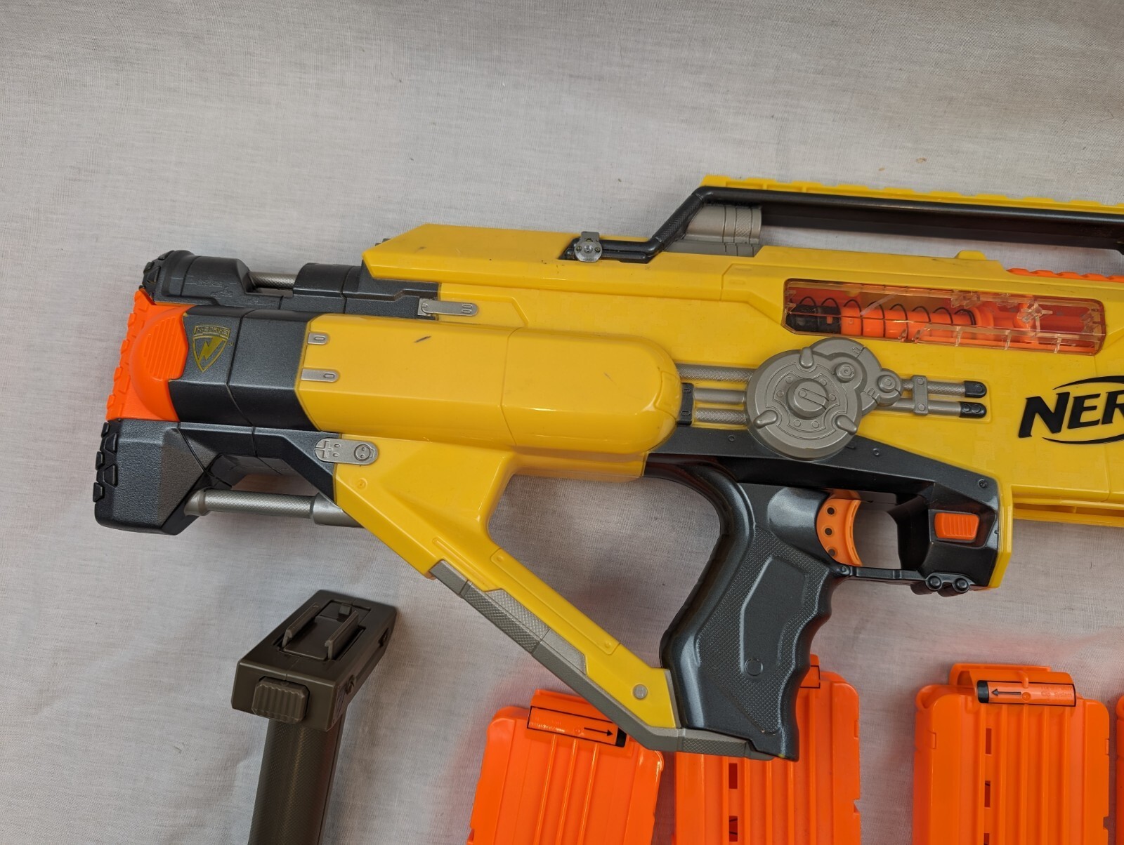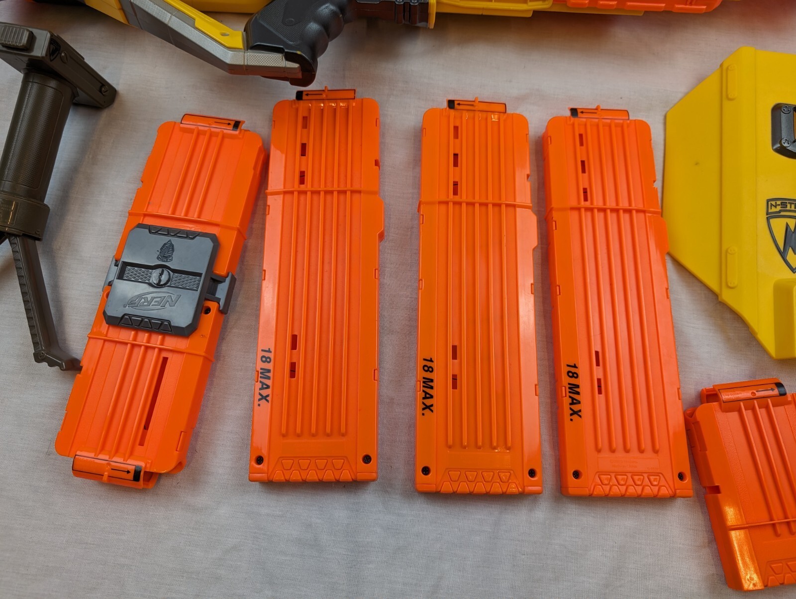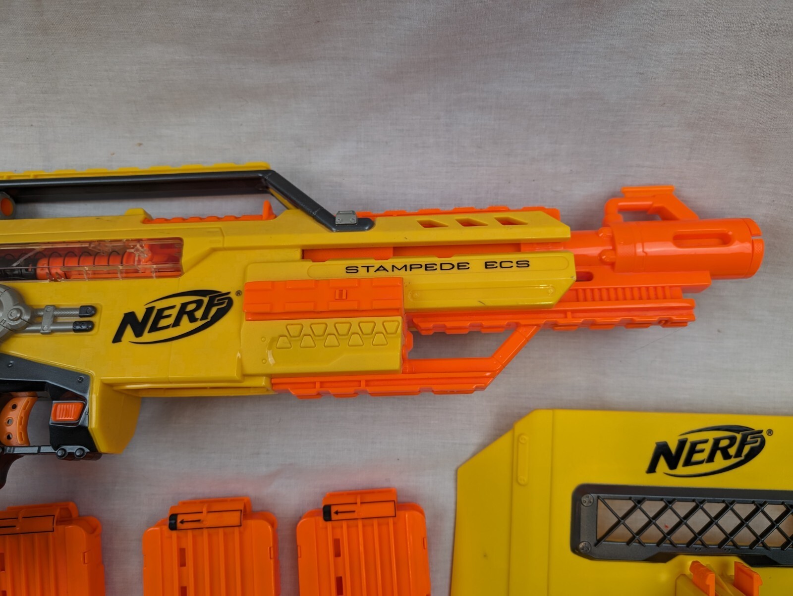 Up for sale is a NERF Stampede ECS w/ Attachments, 3 18 Dart Clips, 2 6 dart clips w/ connector, another 6 dart clip the Tactical Light Face Shield and a bunch of darts--everything in the pictures is included (sorry, the darts are shown in the pics but rest assured I will include at least 40 of them)