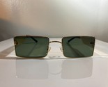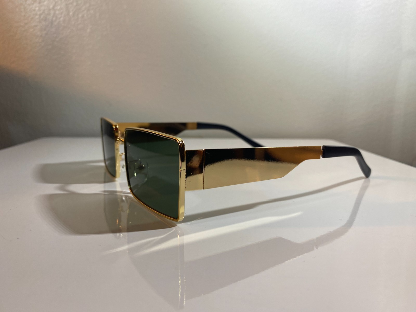 - Unisex, rectangular sunglasses with green lenses and gold wire frame.