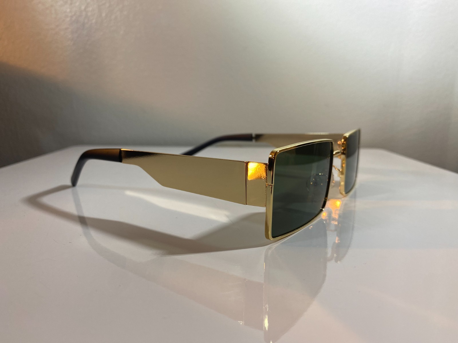 Unisex, rectangular sunglasses with green lenses and gold wire frame.