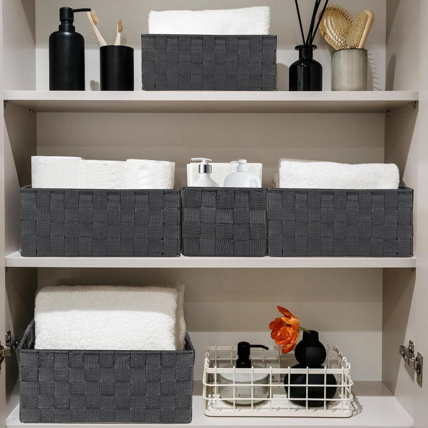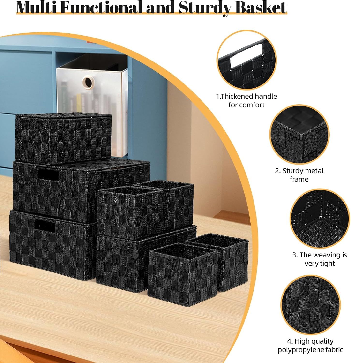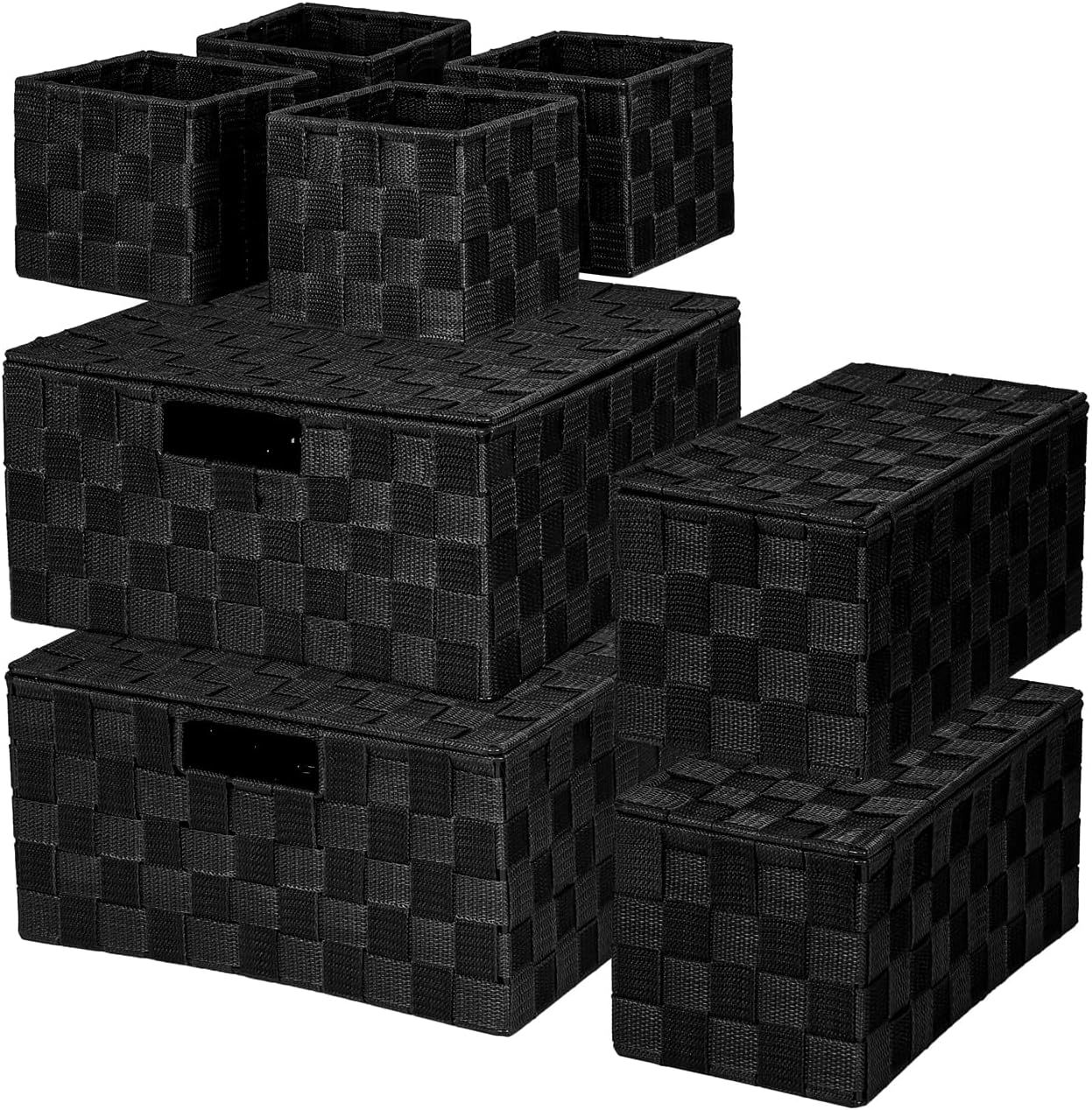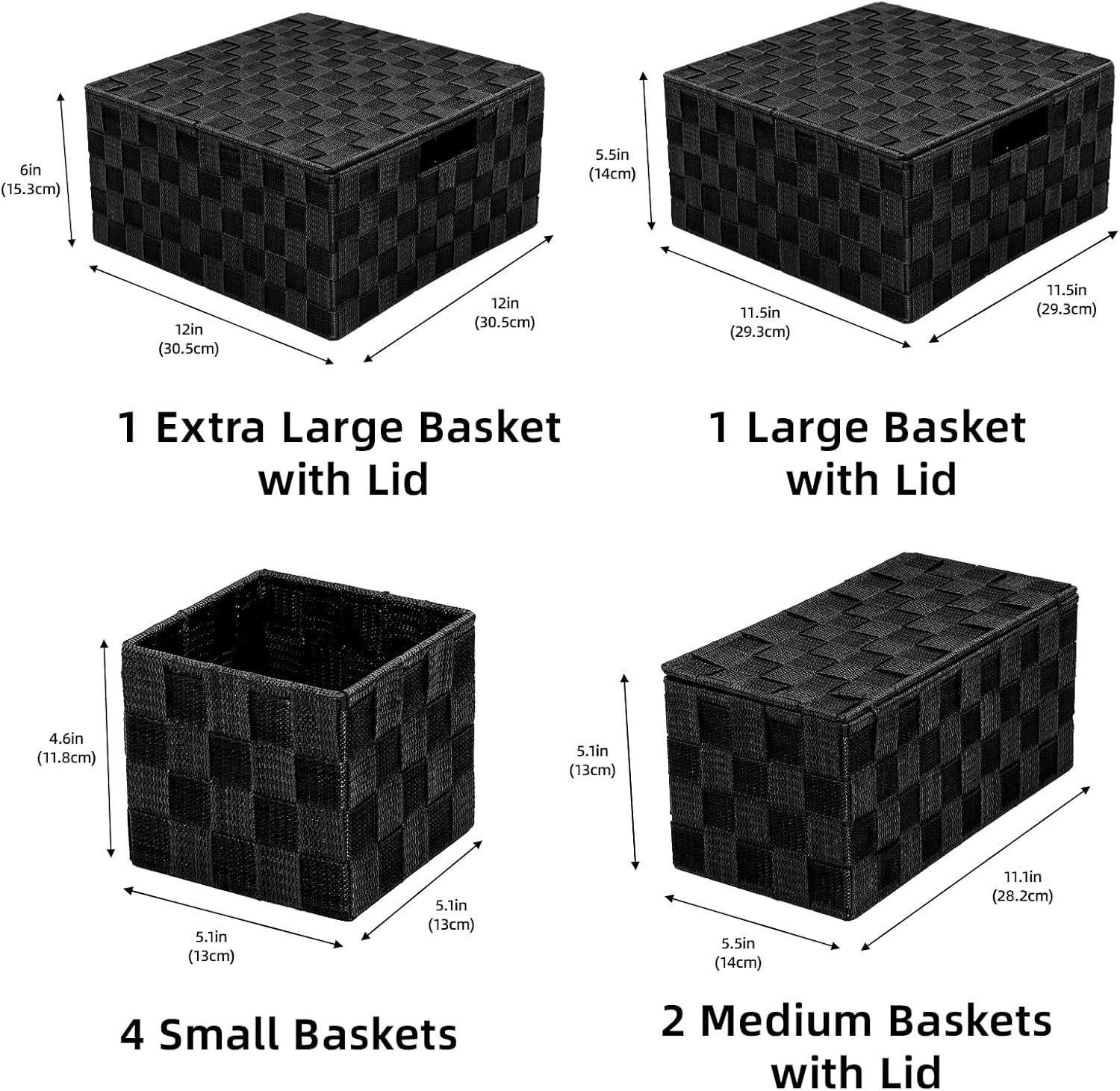 polypropylene 4 Different Sizes Baskets: 1 piece (with Lid) - 12 x 12 x 6 inches, 1 piece (with Lid) - 11.5 x 11.5 x 5.5 inches, 2 pieces (with Lid) - 11.1 x 5.5 x 5.1 inches, 4 pieces (without Lid) - 5.1 x 5.1 x 4.6 inches. Multiple-sized woven baskets are suitable for different items and fit perfectly on many shelves, making them versatile for various purposes. High Quality: Handcrafted from durable polypropylene ribbon with a stainless steel tube frame, these woven storage box baskets maintain their woven organizer bin shape well over time. The material of this woven storage box basket is strong and resistant to oxidation, ensuring long-term use. The tight weave prevents small items from falling through. These woven storage box baskets offer ample sections for organizing multiple options, helping your house or apartment feel neater and cleaner. Neutral Color: Not only will our woven storage box basket closet organizer help you get organized, but their sleek shape and classic colors will complement any decor and any room, fit perfectly on the toilet tank, bathroom counter or any other place, keeping your things organized, nice present for housewarmings, Valentine's Day, birthdays, weddings, or any other occasion. These woven baskets can be stacked or used individually. Versatile Storage Basket: Each of these decorative storage woven baskets serves as a closet bin or pantry organizer, making them excellent for shelf storage. You can also use them as bathroom baskets to hold toilet paper rolls, cosmetics, small bottles of perfume or cologne, and various other accessories, making them an ideal bathroom storage organizer. Nice Present for Family: Utilize them in every corner and for every need, including accessories, clothes, handbags, bedding, socks, clothing, blankets, shoes, photos, snacks and books. They also make excellent present baskets for occasions such as bridal showers, holiday arrangements, hostess packages, or as thoughtful gestures. They help you save space and keep things neat at all times.